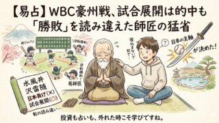 WBC日本対オーストラリア戦を易で占った結果、試合展開はほぼ的中。しかし終盤の「転」を読み切れず勝敗は外れ。占断の振り返りと師匠の反省をまとめました。