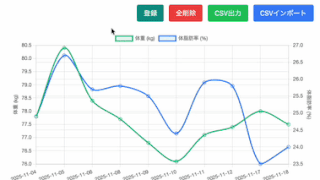 自作アプリ 体重・体脂肪率をシンプルに管理するアプリ 毎日の体重と体脂肪率をブラウザだけで管理できる Weight & Fat Trackerを作りました。データはローカルストレージに安全保存、CSVでバックアップ・インポートも可能です。簡単操作で継続しやすい! 2025.11.15 自作アプリ