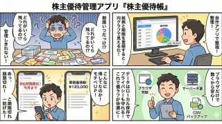 株主優待 株主優待_管理アプリ 株主優待が増えると管理が大変。『株主優待帳』はブラウザだけで銘柄・優待券を登録し、円グラフで残高や期限を可視化。CSV 連携でデータのバックアップも簡単に行えます。 2025.12.23 株主優待自作アプリ