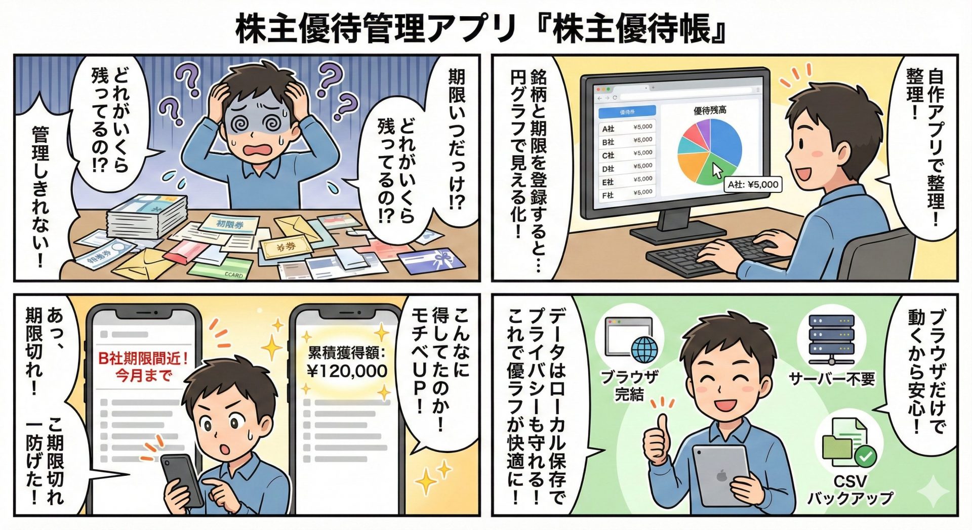 「株主優待帳」はブラウザだけで完結し、サーバー不要・プライバシー安心な株主優待管理ツールです。