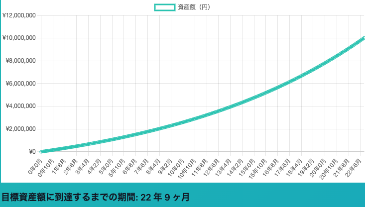 結果:「毎月1.5万円積み立てで、7%の年率前提だと約22年9ヶ月で1000万円に到達」