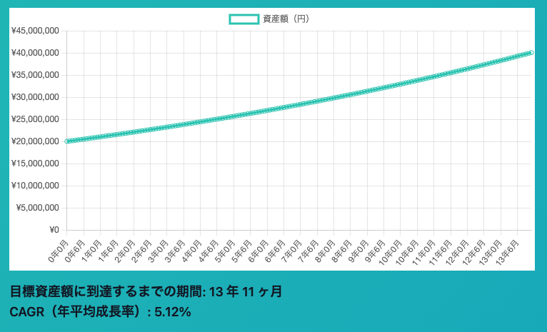 結果:「約14年で目標に到達」「CAGRは約5%」と表示。グラフでは「投資開始直後から順調に伸びる」のが確認できます。