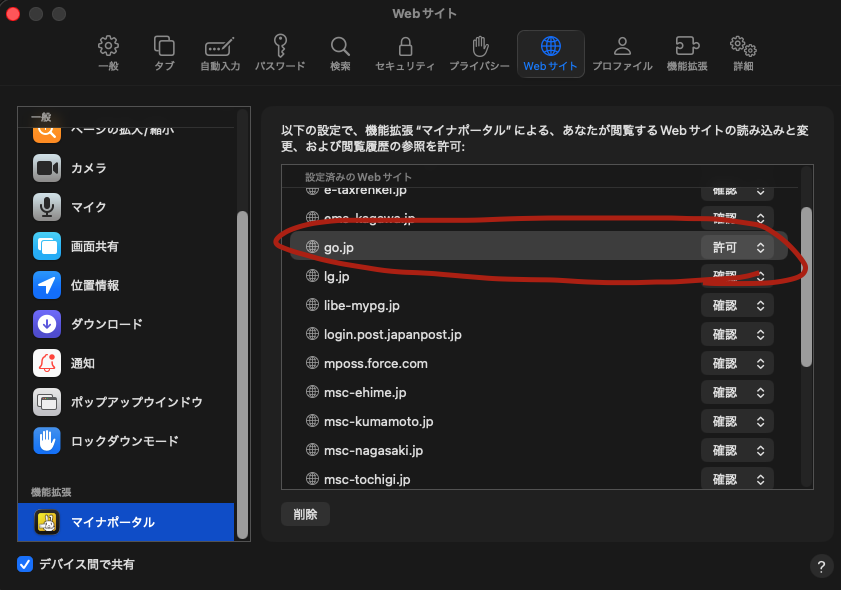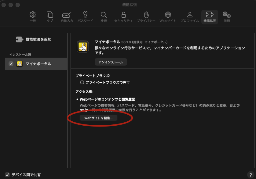 1. メニューバーのSafari→設定→機能拡張→Webサイトを編集 をクリック