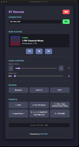 幸いなことに、SoundTouchにはローカルネットワーク内で直接命令を送れる Local API が公開されています。そこで、自分専用のリモコンアプリ 「ST-Remote」 を作成しました。