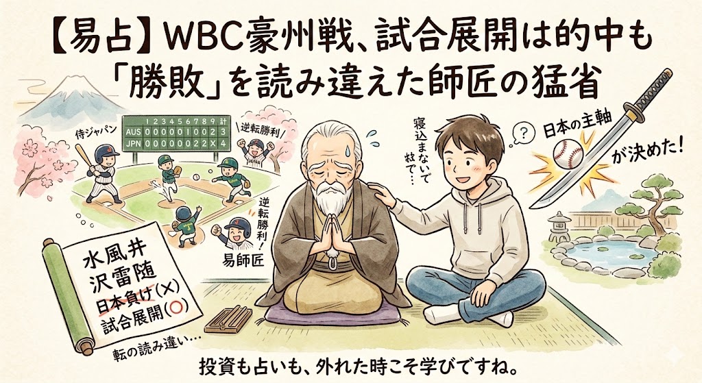 オーストラリアが引き当てた『水風井』の第五爻は、一点の曇りもなき清らかな泉のごとき実力を示しておったが、師はそれが「その場に留まり続ける」という静的な側面のみに目を奪われ、変化を見逃してしまったのじゃ,,。日本が序盤に得点できず苦戦したのは、『沢雷随』の第二爻が予兆した通り、目先の些細な事象に執着して本来の力強い攻勢を見失っていたからに他ならぬ,。