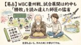 | 最終結果 | 日本が逃げ切る(ただし油断禁物) | 5-8で敗戦。追いつけず終了 | △警告的中 |